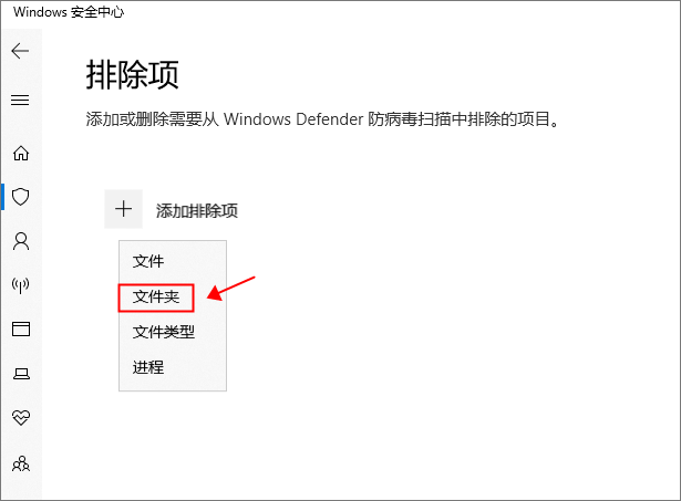 ⑤ 添加排除项点击“+”号会弹出四个选项,可以直接添加文件、文件夹,也可添加某种文件类型,这里我们选择添加文件夹。